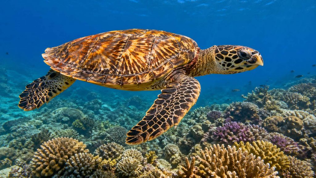 The hawksbill gets its name from the shape of its beak. Narrow and pointed, curving downward at the tip, it looks almost exactly like the beak of a hawk, which is unusual enough in a sea turtle that researchers gave the species its common name before they settled on a scientific one. The scientific name, Eretmochelys imbricata, refers to the overlapping arrangement of the shell’s scutes, which give the hawksbill a layered, almost architectural look. The colors shift from amber to gold to deep brown depending on the light, and underwater they can look almost luminous.